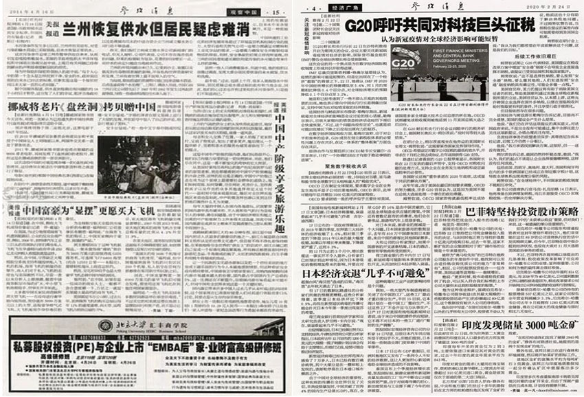 《參考消息》不僅是國內(nèi)大量心水政、經(jīng)、文、科、法等新聞領(lǐng)域的重要來源之一,也是國內(nèi)唯一的指標(biāo)性國際期刊。它從全球及時跟蹤和報道重要的國際新聞事件,可以讓讀者客觀地了解整個世界的發(fā)展和變化趨勢,為大家的觀點(diǎn)、思考和抉擇提供支持。在報道海外政治經(jīng)濟(jì)動態(tài)的同時,也注重對國內(nèi)經(jīng)濟(jì)社會的報道,對大陸和港澳臺的時局和社會熱點(diǎn)進(jìn)行深度的報道和分析。