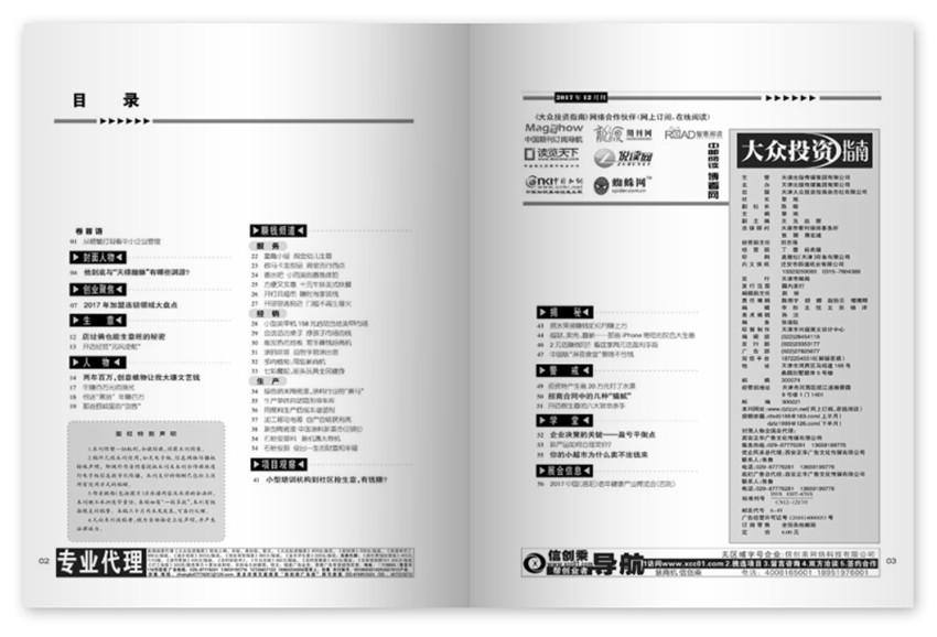 更加注重深入研究中小投資市場(chǎng)規(guī)律,總結(jié)十多年辦刊經(jīng)驗(yàn),匯總成千上萬(wàn)的讀者需求,打破了以往的內(nèi)容安排和欄目設(shè)計(jì),將以新面孔奉獻(xiàn)給廣大讀者,通過(guò)對(duì)投資領(lǐng)域的熱點(diǎn)難點(diǎn)問(wèn)題深入地報(bào)道和研究,為小企業(yè)和創(chuàng)業(yè)人士尋找更豐富、更真實(shí)、更可行的財(cái)富之源,緊抱投資,心向指南,是中小投資創(chuàng)業(yè)者早日走上富裕階層的良師益友。廣告贈(zèng)頁(yè)信息量大,為投資者提供各種投資資訊,致富信息。