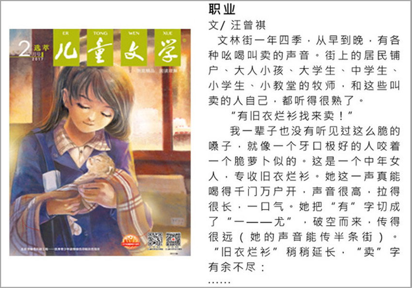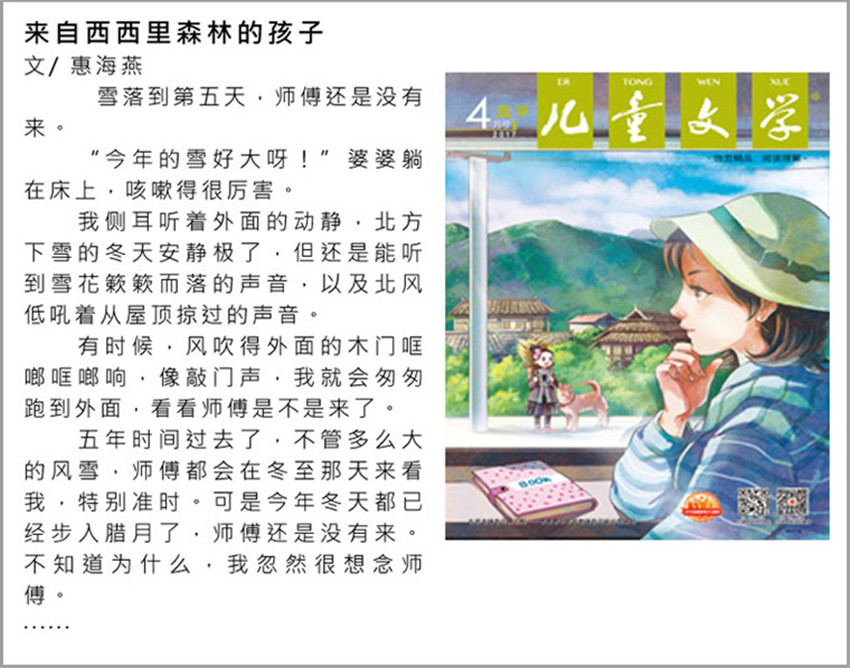 《兒童文學(xué)》工整、清晰的印刷,優(yōu)美的配圖,增加了孩子喜歡它,讀它的理由,文章將閱讀的趣味性與實(shí)用性完美相結(jié)合,在中外著名繪本與童話故事中寓教于樂。讓更多的孩子參與閱讀、寫作。