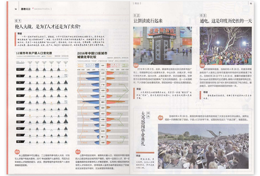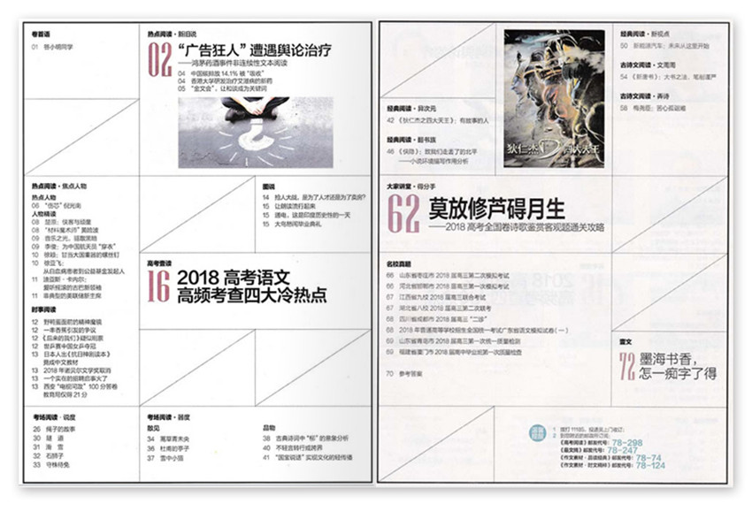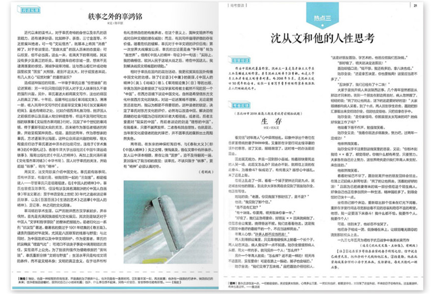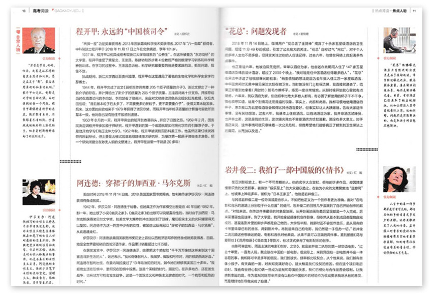 《高考閱讀》雜志主要是運用熱點時事和熱點人物的材料進行命題,匯集了最新的熱點事件和熱點人物,能夠將最新的熱點材料一網打盡,幫助學生全面學習和運用熱點材料;第三個部分對經典的小說、散文閱讀的命題,匯集精選歷代名作、名家作品進行命題;第四部分則是一線名師根據名家名作的押題。