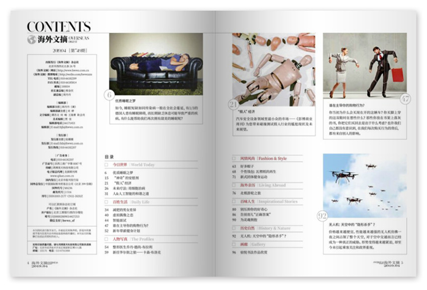 《海外文摘》主編說:匆忙之中,你是否停下來,好好觀察過我們生活的世界,看一看這個五顏六色的世界的多種多樣的生活。很多時候,我們需要從自己的世界走出來,看一看生活之外的世界,把心思和眼界從辦公室的格子間里釋放出來,帶著眼睛和心靈四處走走,看得越多眼界越高,生活也會大有不同。如果生活囿于繁瑣,可以試試這本《海外文摘》。