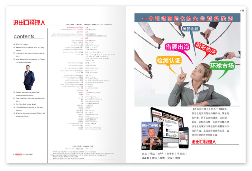 《進(jìn)出口經(jīng)理人》雜志創(chuàng)辦于1988年,注重理論聯(lián)系實(shí)際,創(chuàng)刊多年來(lái)得到了長(zhǎng)足發(fā)展,雜志內(nèi)容充實(shí)、版式清新,裝幀精美,深受廣大讀者好評(píng),國(guó)內(nèi)外公開(kāi)發(fā)行的一本激揚(yáng)人生的外貿(mào)商務(wù)雜志。