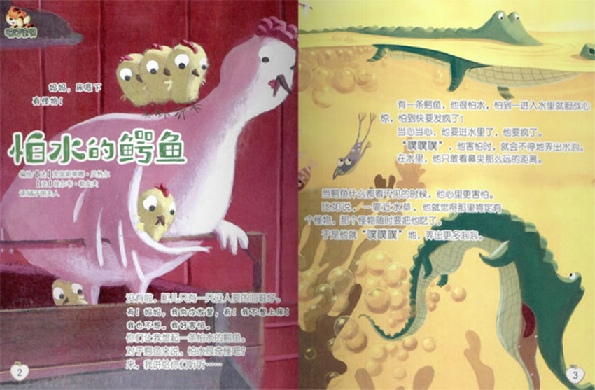 噓噓!注意,鱷魚來了!他在那里做什么呢?他要去奶奶家,他奶奶住在河對面,他帶了一塊薄餅和一瓶果醬。這些都不重要,重要的是他要怎么過河。那兒有水,而鱷魚是怕水的!可不是嘛,他又要害怕得弄出噗噗的聲音了!突然,鱷魚看見了巖石!