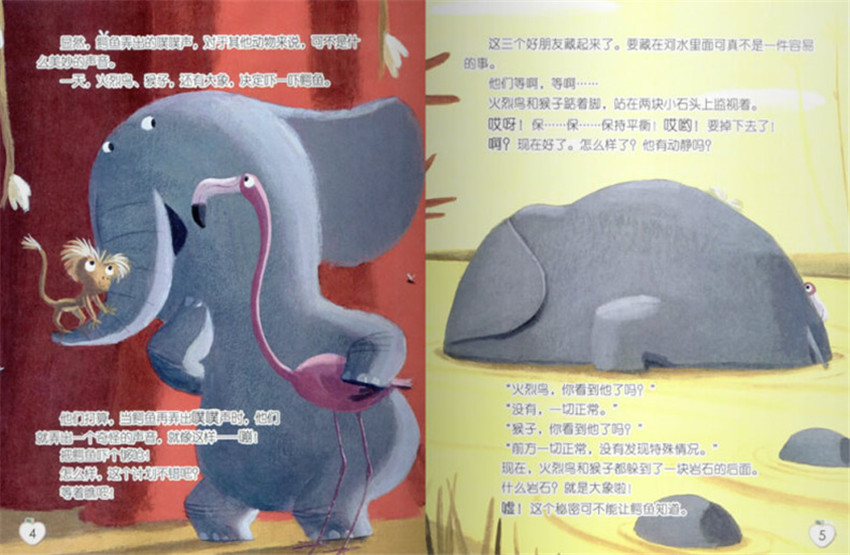 咔!鱷魚一口咬在巖石的屁股上。呃,應該是大象的屁股上。哎呀!哎喲!大象疼得跌倒在水里啦!火烈鳥和猴子也跟著遭殃啦!哎呀!哎喲!火烈鳥為了不掉進水里,慌忙抬頭,一口咬住了猴子的尾巴!“咕嚕嚕’,猴子被拖進水里,可是他不會游泳...啊!噗!鱷魚也沉到了水里....