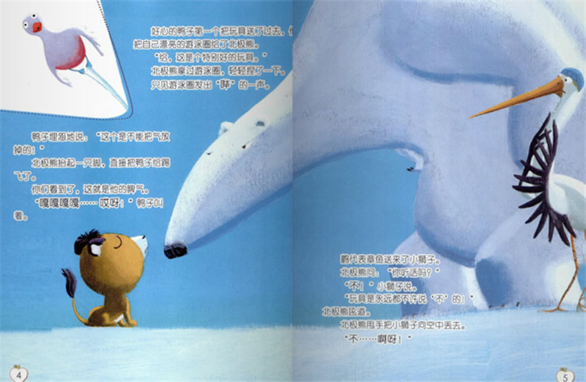 好心的鴨子及時一個把玩具送了過去,把自己漂亮的游泳圈給了北極熊,“給,這是個特別好的玩具,北極熊拿過游泳圈,輕輕捏了一下。只見游泳圈發出“嗶”的聲。鴨子埋怨地說:“這個是不能把氣放掉的,北極熊抬起一只腳,直接把鴨子給踢飛了,你們看到了。這就是他的脾氣。“嘎嘎嘎嘎..哎呀1”鴨子叫著。