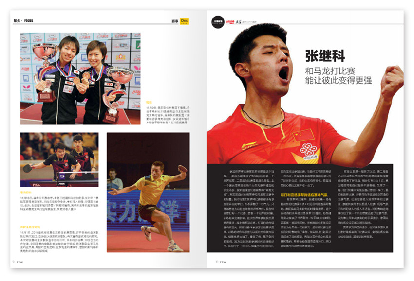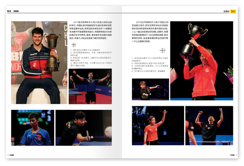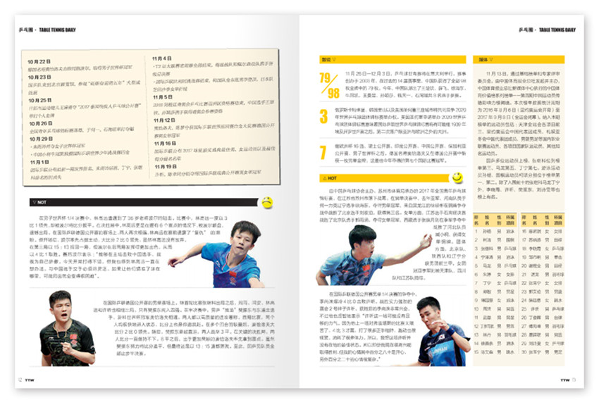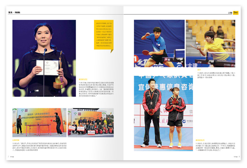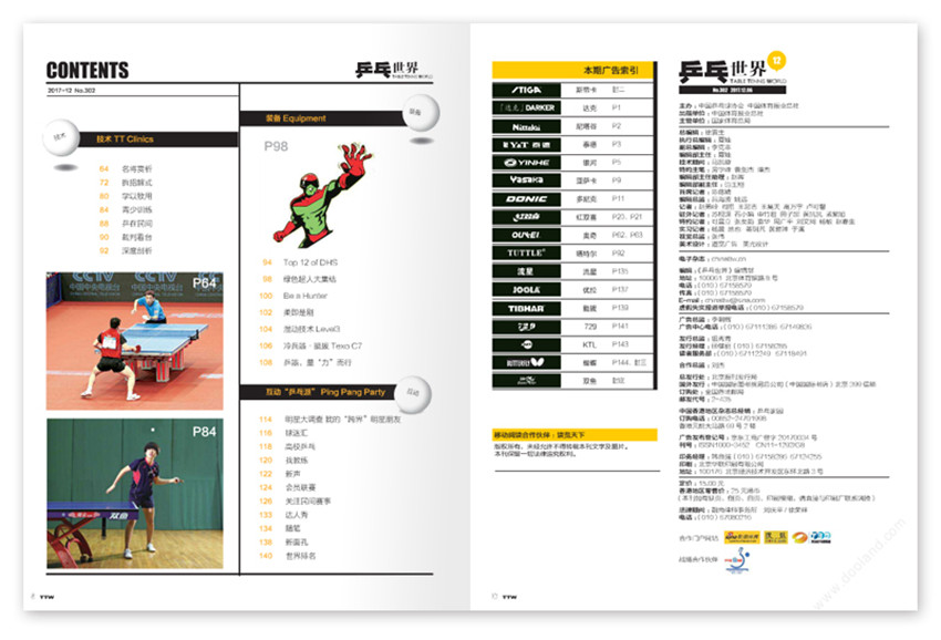 《乒乓世界》雜志創辦于1981年,注重理論聯系實際,創刊多年來得到了長足發展,雜志內容充實、版式清新,裝幀精美,深受廣大讀者好評。以提高球技為重點的“創新園地”、為球迷服務的“檔案館”、“偶像天地”、“國手直通車”、“教你一招”、“兵器譜”等。