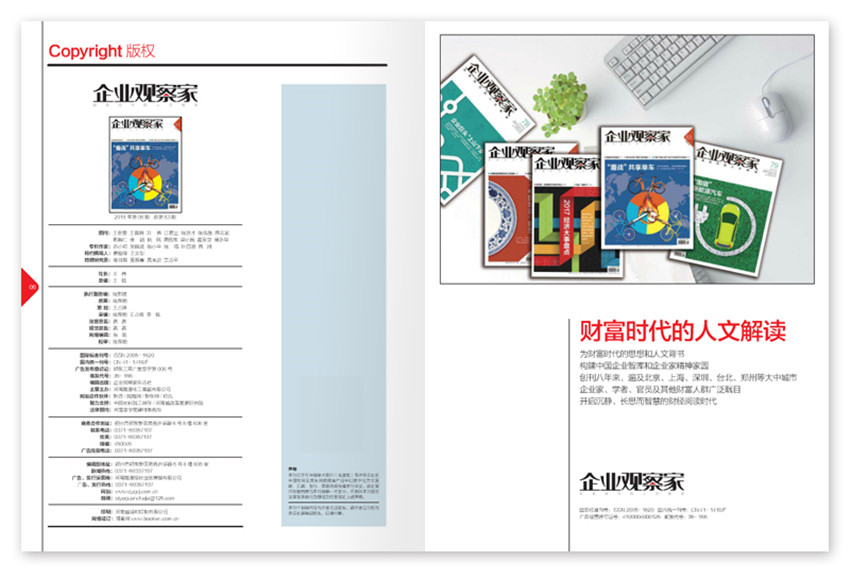 《企業觀察家》雜志聚焦經濟動態,揭示深層財經問題,交流企業界經營管理之道,反映企業界豐富人生,書寫企業家智慧,搭建中國企業發展智庫。,弘揚市場人文關懷,在激勵人們創造、追求財富的同時,倡導有價值的商業文明和商業精神,建設中國企業的商業規則和商業價值體系。