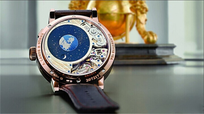 月球裝置顯示裝飾華麗,不僅呈現(xiàn)當(dāng)前的月相,更展現(xiàn)月球?qū)?yīng)太陽的位置及在夜空中運行的軌跡。RICHARDLANGEPERPETUALCALENDAR“Terraluna”的專利軌跡月相顯示同樣是精密制表領(lǐng)域的創(chuàng)新杰作。此無比的裝置,描繪月球?qū)?yīng)地球和太陽的不斷變化的位置關(guān)系。